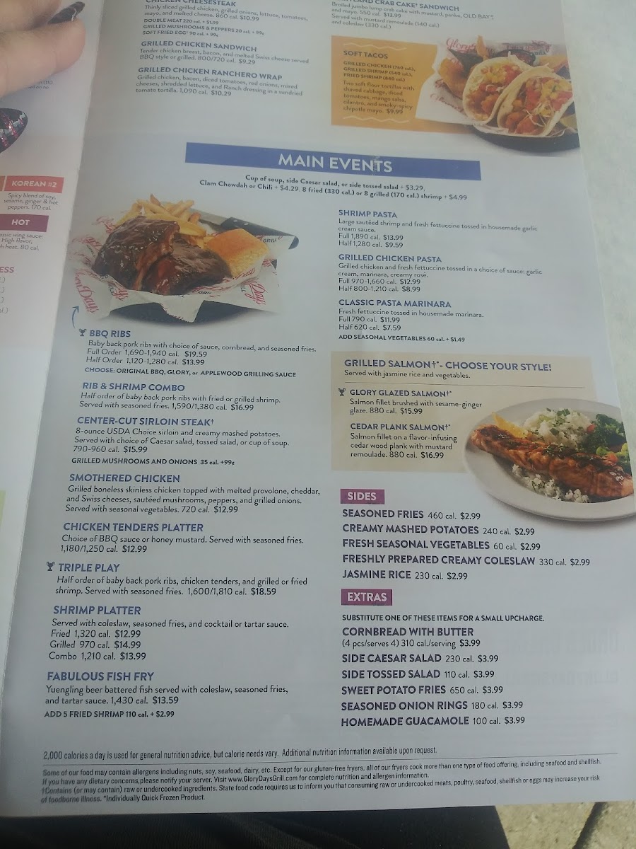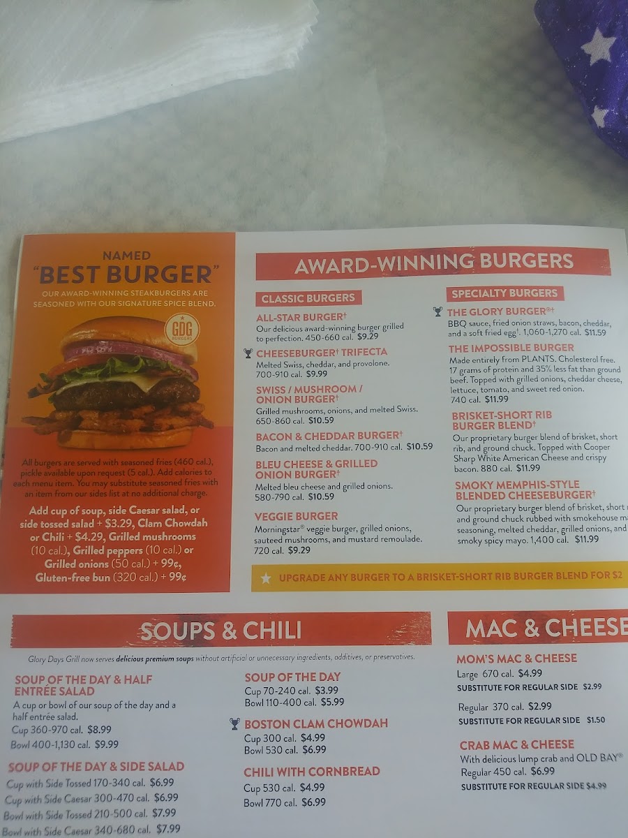 Complement your meal with a variety of sides—think mac n cheese, seasoned fries, and cornbread—all crafted to elevate your dining experience. With a welcoming atmosphere and attentive service, Glory Days Grill promises not only great food but also a memorable outing. Don't miss out on this local gem in Towson where comfort food shines!